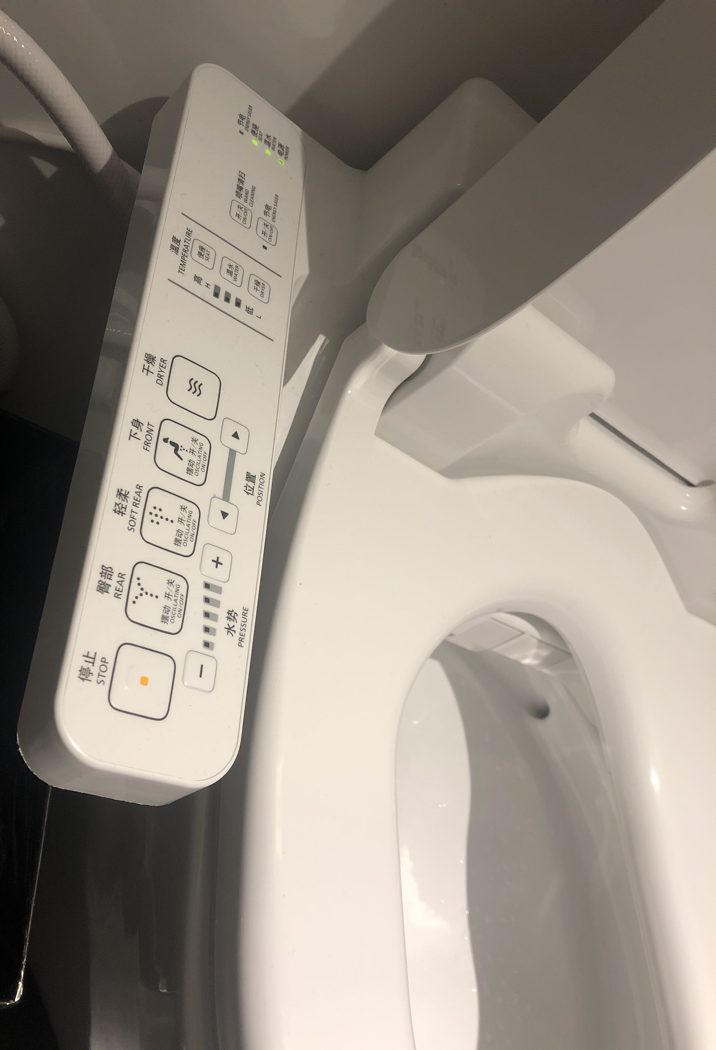 En bra sak – de har en fjärrkontroll på toasitsen. Här kan man välja sitsvärme, fläkt och lite andra helt onödiga funktioner. Det var ändå rätt skönt med värmen i baken men helt klart överkurs & kontrast mot transfergrejen. Nja, Kina imponerar inte så här långt men det är ju mer än en flygplats, det hajar jag.