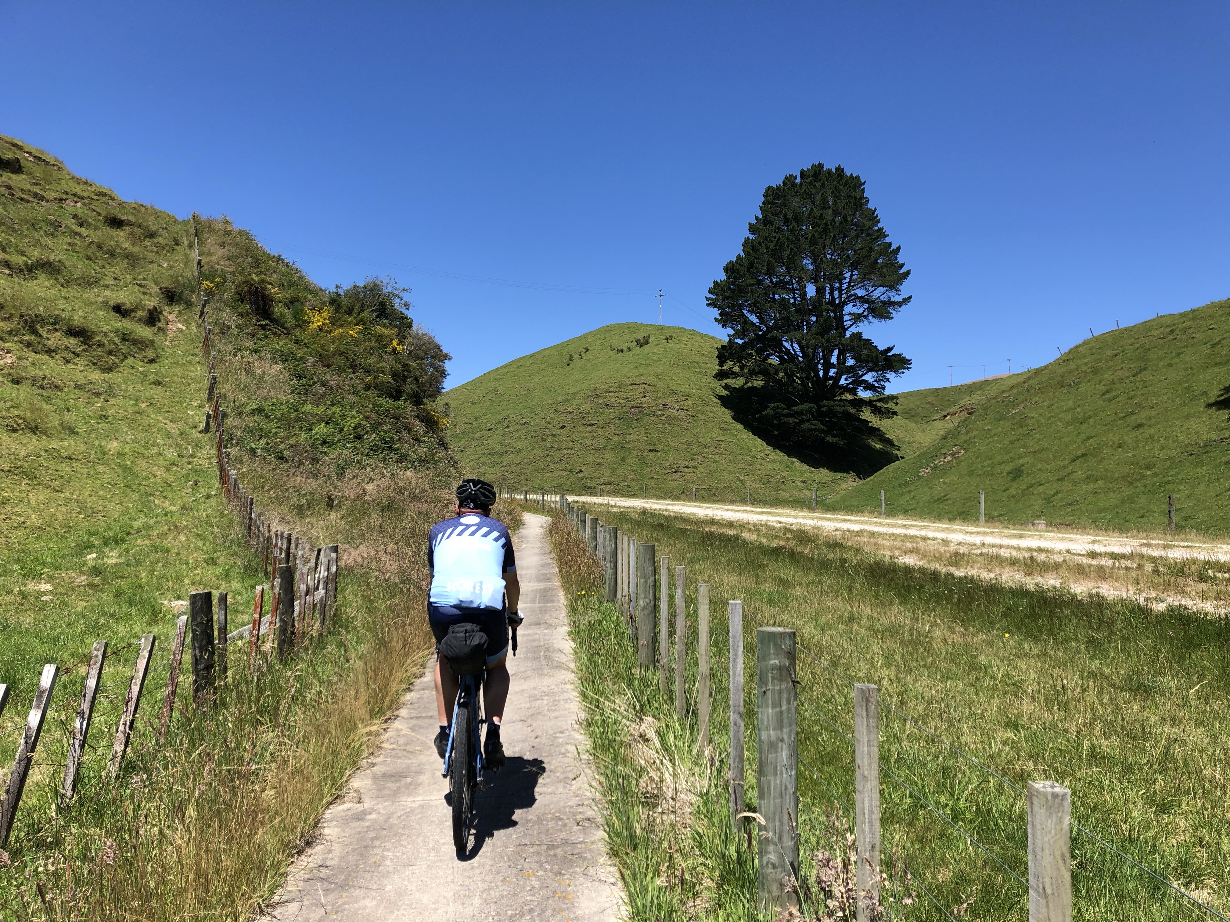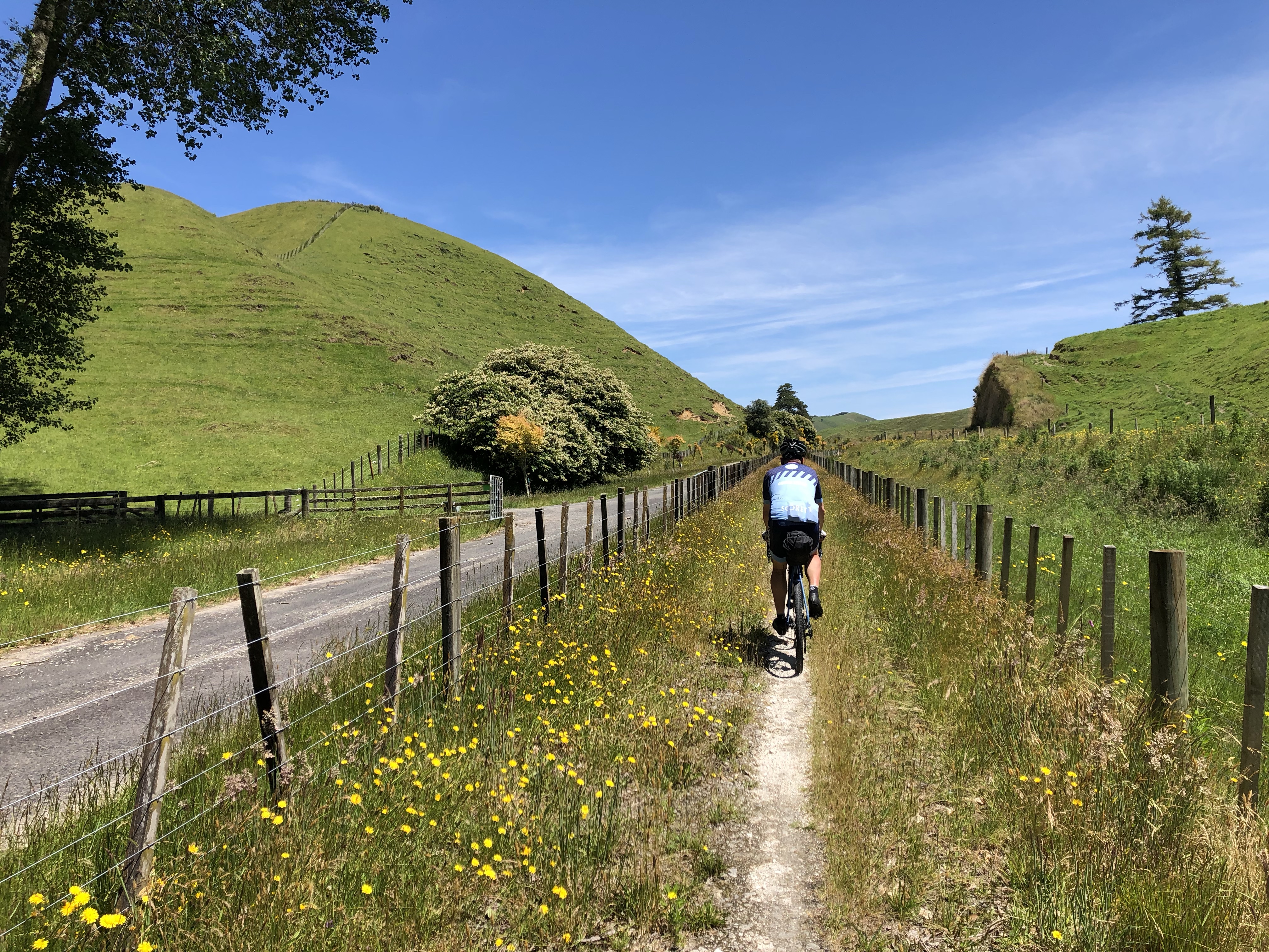 Trailen inleds med en lång betongled i en dryg mil innan själva etappen börjar. Vi viker då av på små naturstigar som är superfina, en del singletrack och ibland asfalt. Vyerna är som alla andra dagar – magiska att få framför ögonen. Det är en ynnest att få cykla denna trail.