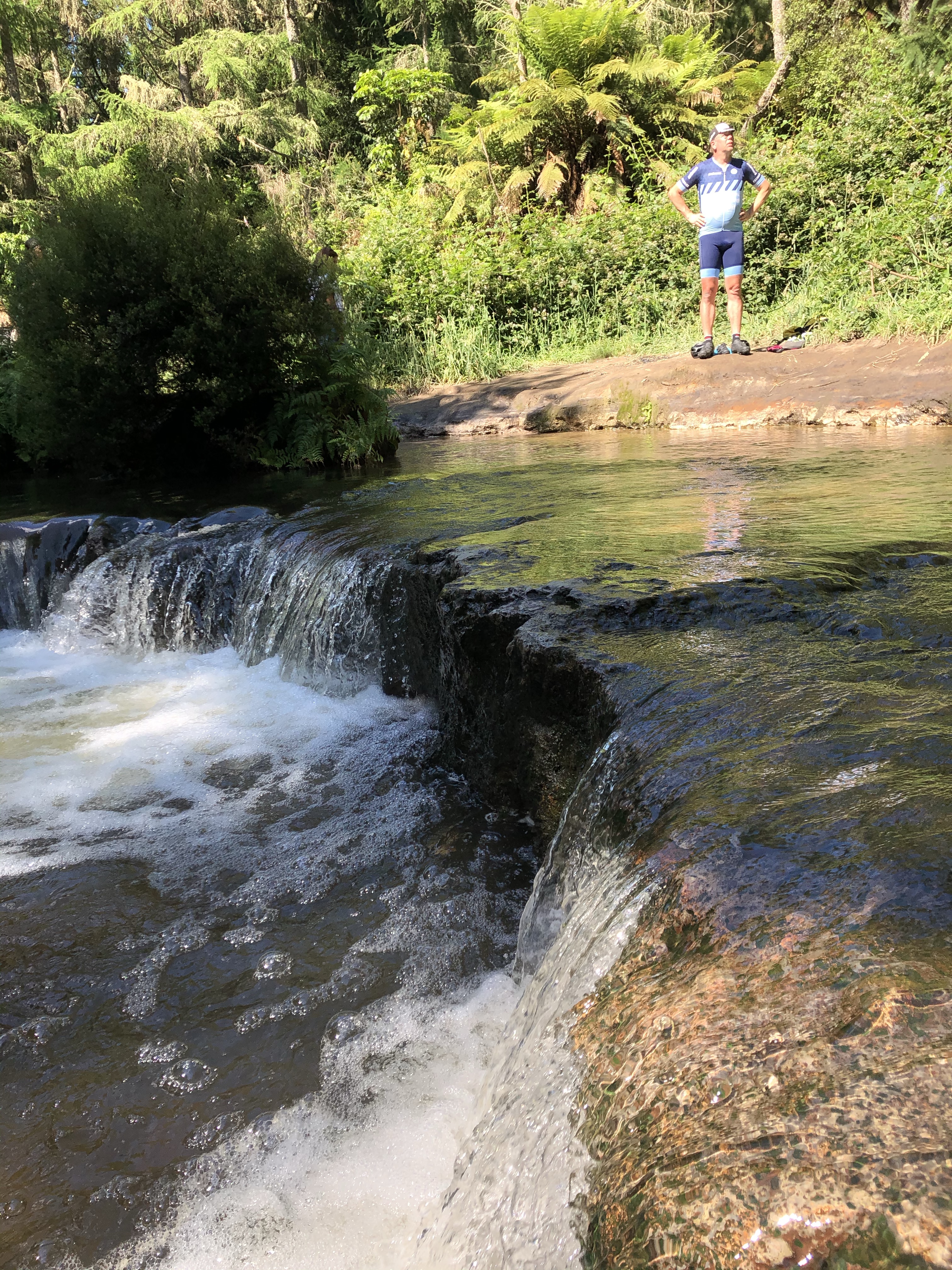 Efter 2 km tar vägen tvärt slut och en vägbom tar vid. Här kommer en halvnaken man och stoppar oss & upplyser om att vi kört fel. Synd för oss säger han men också att vi ju kan passa på att bada i den varma strömmen som ligger precis inne bland buskarna.