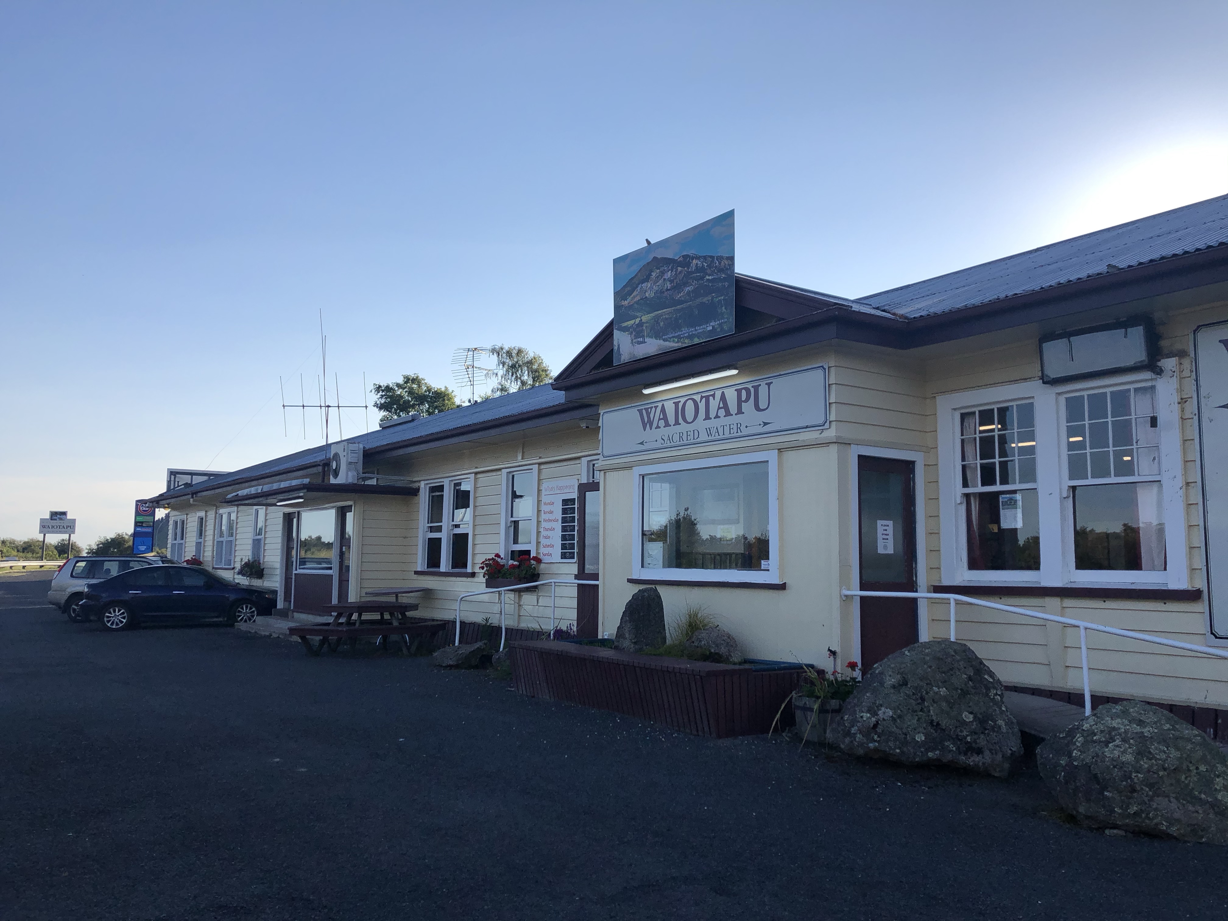 Vi får ju köra tillbaka på grusvägen och sen ut på huvudvägen i 3 km innan vi är framme vid Wai-o-tapu Tavern där vi ska sova. Det här verkligen är mitt ute i ingenstans och stället är så charmigt som det ser ut. Ett riktigt hak!