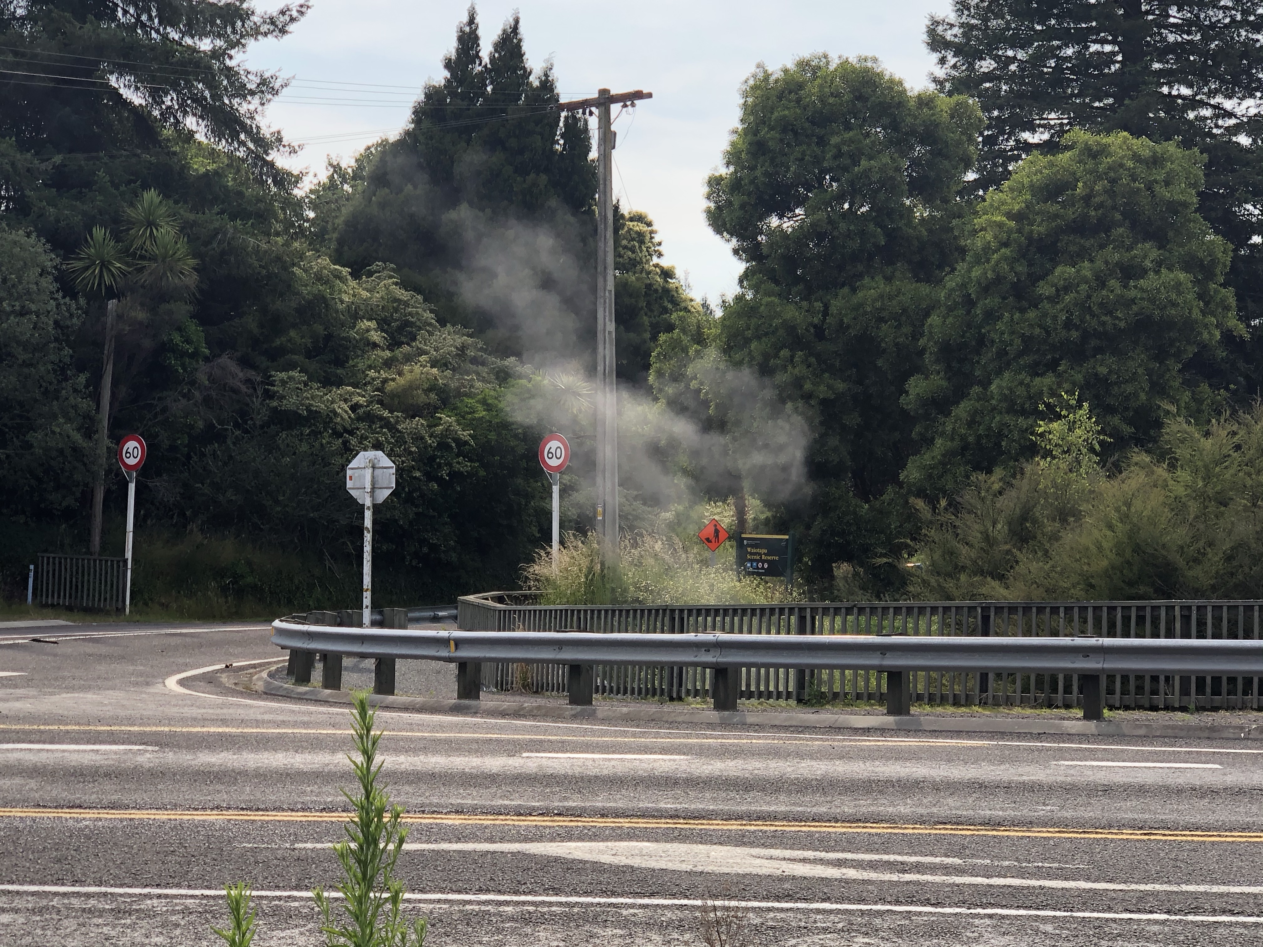 Överallt runtomkring oss ryker det i buskar, ur avloppshål och från bäcken som rinner på andra sidan vägen. Riktigt hett ställe som kryllar av thermalpooler vart du än tittar. Det är som att befinna sig i en Stephen-King-film. Jag tycker ändå att det verkar rätt praktiskt att ha inbyggd golvvärme där man bor😃