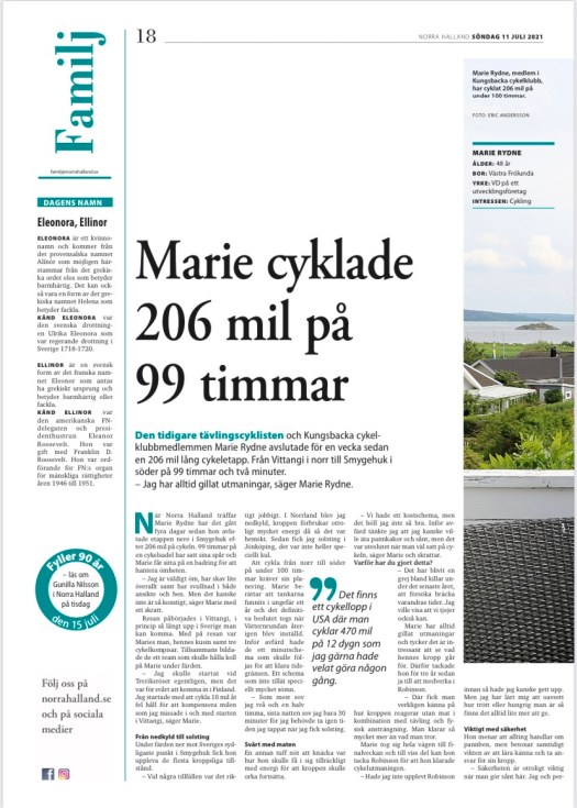 Marie ankom till Smygehuk kl 09:02:15 Söndag den 4e juli 2021 – vilket innebär att hon cyklade den 206 mil långa färden genom Sverige på 99 tim 02 min 15 sek. Starten gick onsdag 30 juni kl 06.