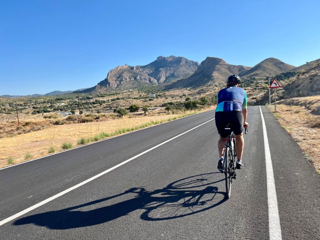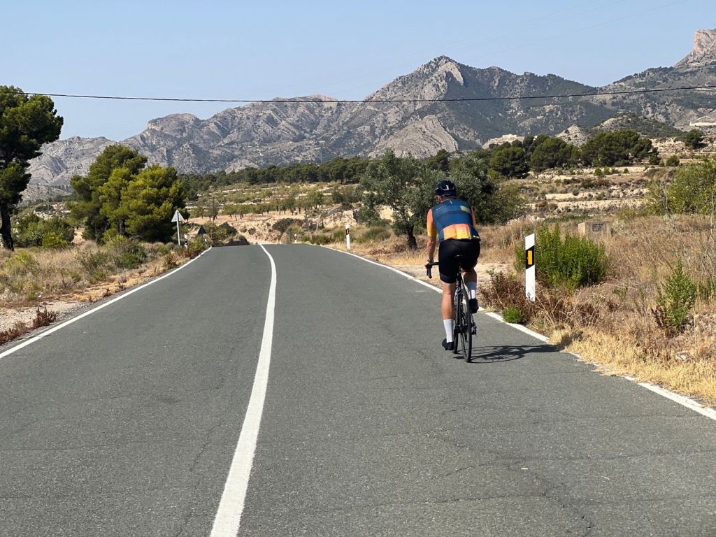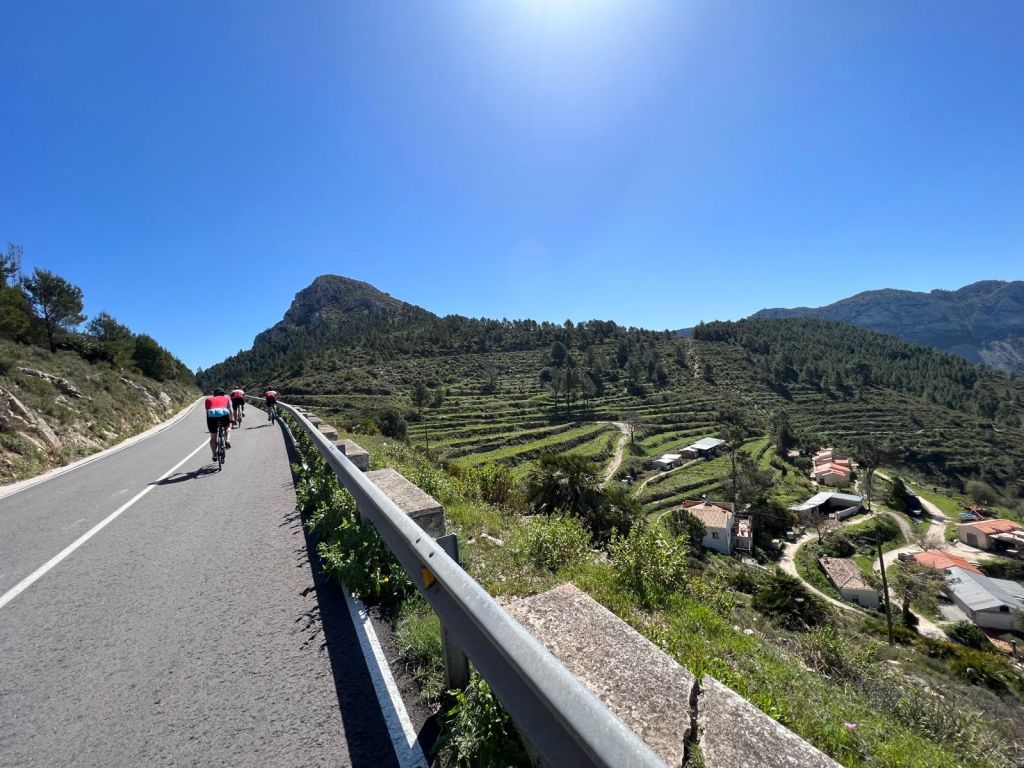 Vägen upp till Finestrat är bra som uppvärmning, en lättare stigning pĂĄ cirka 17 km räknat frĂĄn Albir. Uppe i Finestrat kan du stanna till om du behöver fylla pĂĄ vätska, nästa naturliga stopp är Relleu efter en körning pĂĄ ytterligare cirka 1-1,5 timme. Vägen till Orxeta gĂĄr först nedĂĄt, tills du kommer till en damm. Där svänger rutten in pĂĄ en mindre väg och nu börjar en transportled till nästa dal. Denna väg är bitvis kuperad med korta och branta uppförslut. Efter nĂĄgra kilometer kommer du till en större väg där du tar höger in pĂĄ den större vägen mot Relleu. Denna stigning är ”behaglig” och fin att cykla.