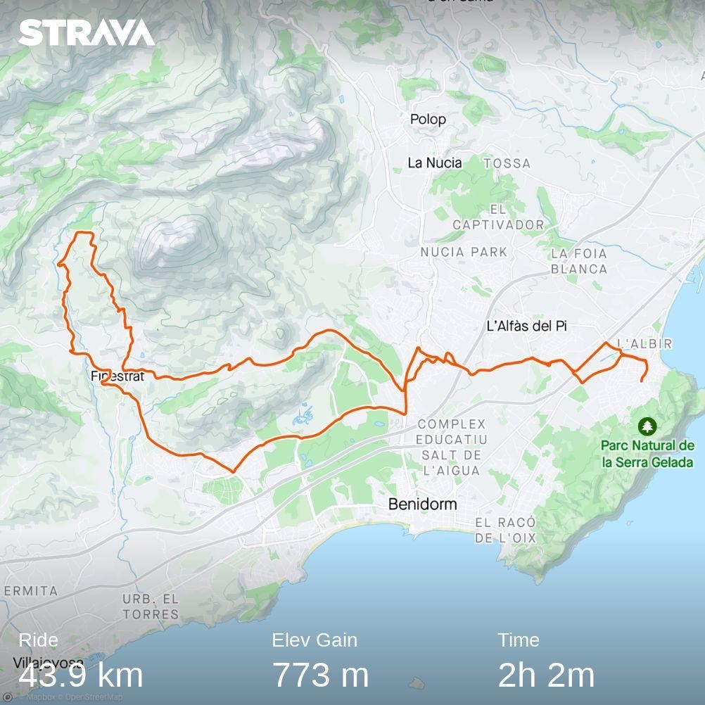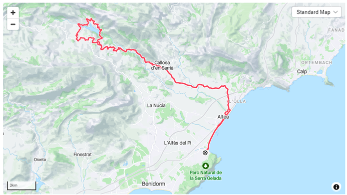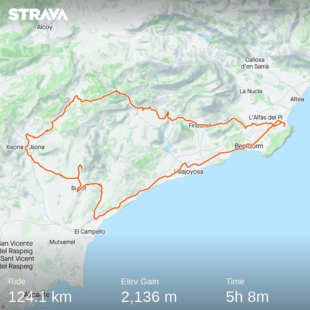 Det här en kort rutt för en dag dĂĄ du vill göra annat än enbart cykla. Du kör ”innevägen” upp genom Alfas del Pi, en lokalväg som passar bra att värma upp i före du kommer till vägen upp till Finestrat. Stigningen som tar vid är en bra ”köra-pĂĄ” backe med nĂĄgra flackare partier och inte sĂĄ brant lutning.