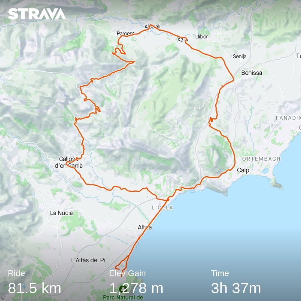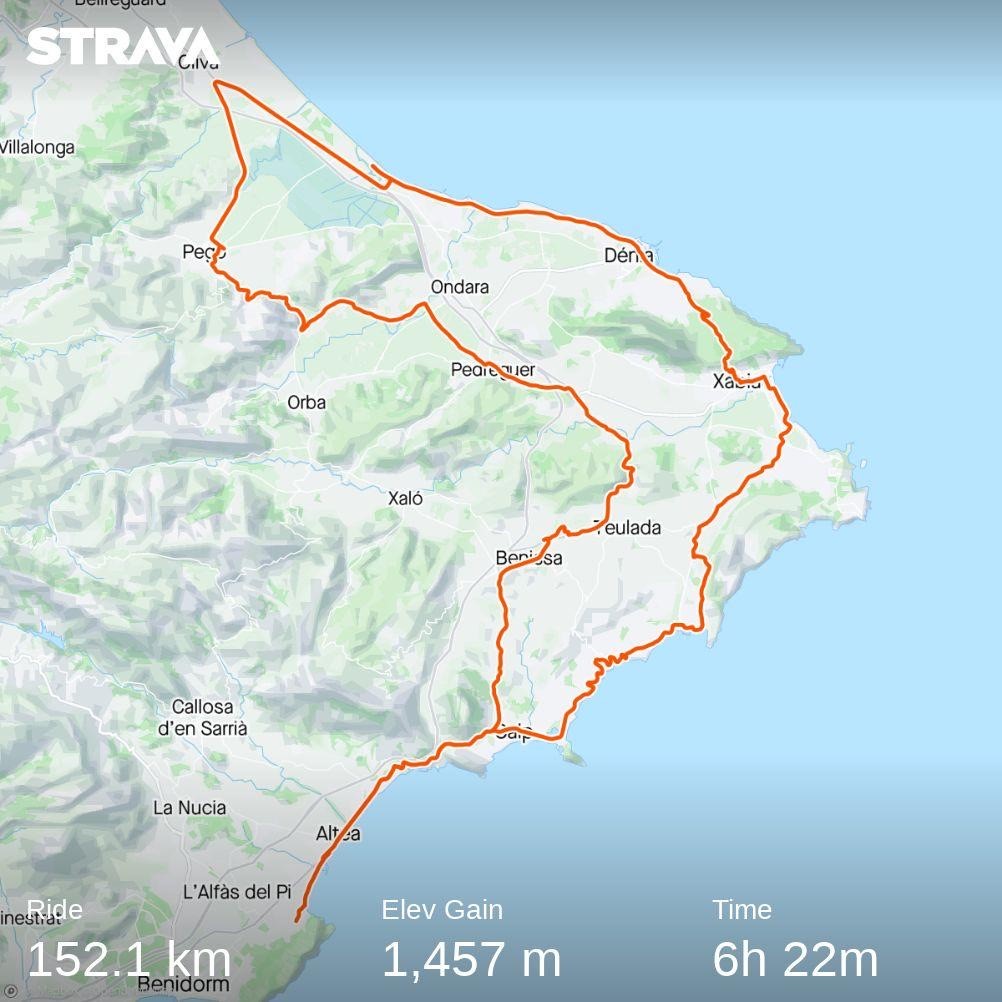 En lĂĄng men ändĂĄ en ”platt” runda för att vara med en sĂĄdan distans. De 1 500 höjdmetrarna pĂĄ rutten är uppdelade i flera olika partier vilket gör att den totalt sett inte känns sĂĄ backig. Vill man ha en lugnare/kortare hemfärd kan man hoppa pĂĄ Tram-tĂĄget pĂĄ nĂĄgon av stationerna längs vägen. Det är möjligt att ĂĄka frĂĄn Denia (dock har det varit reparationer de fyra första stationerna frĂĄn Denia räknat & ersättningsbuss gĂĄr dĂĄ mellan Denia-Gata. Det gĂĄr fint att lasta in cykeln i lastutrymmet pĂĄ bussen).