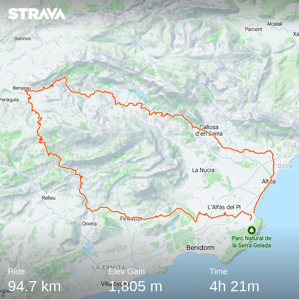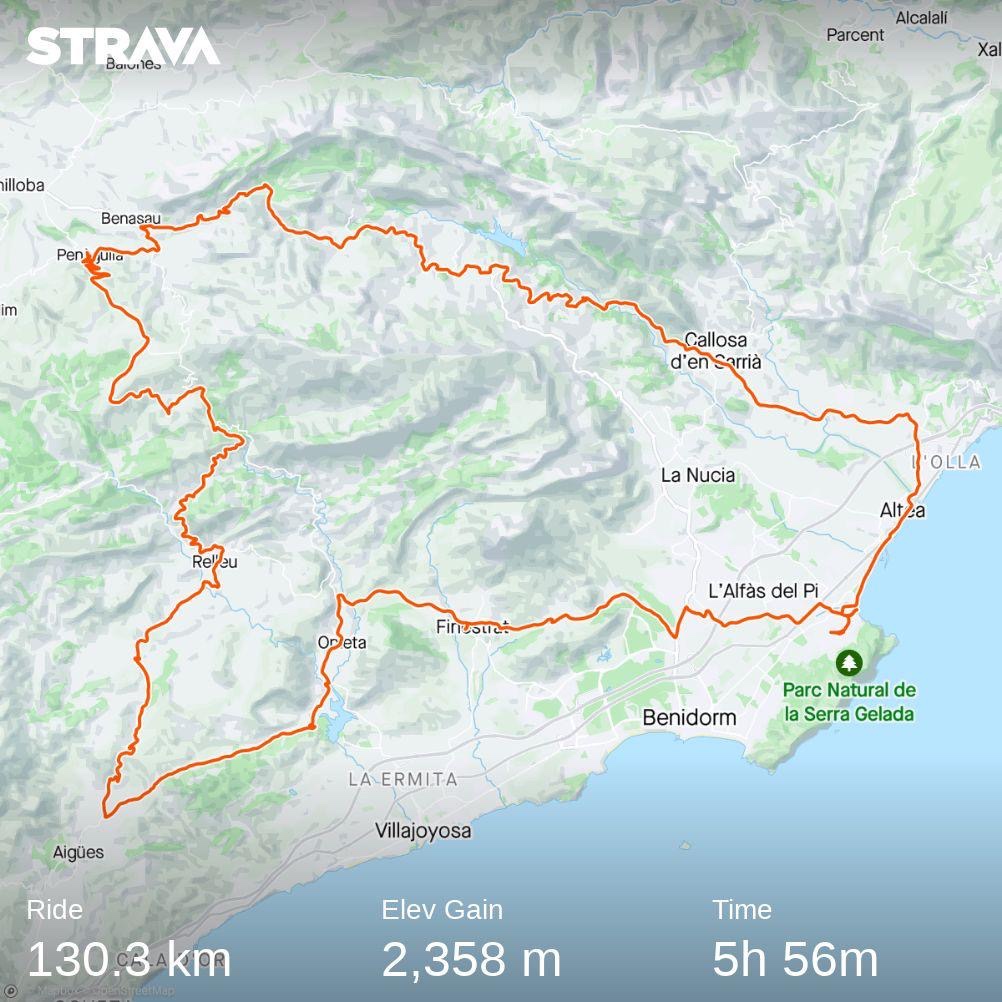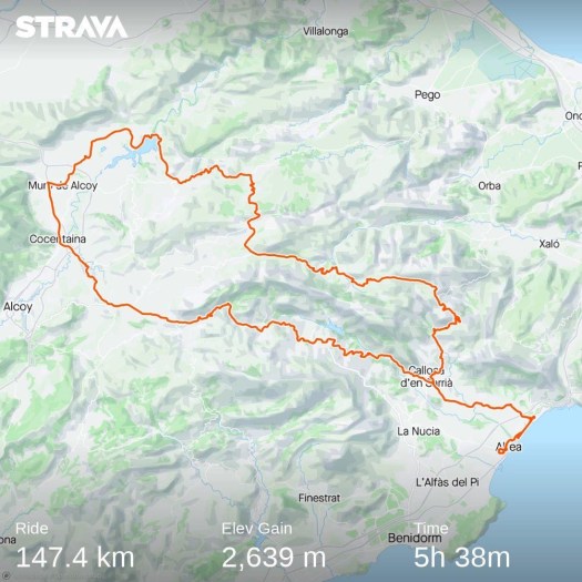 Den här rutten gĂĄr sedan över Relleu pĂĄ hemvägen, utförskörningen är stundtals brant ner dit. Självklart blir det ocksĂĄ en del kullar att trampa sig över – det är sällan nedför exakt hela vägen här. Samma sak är det med vägen tillbaka till Albir/Altea, som i detta fall passerar Finestrat. DĂĄ man cyklar ĂĄt andra hĂĄllet fĂĄr man uppfattningen om att det ska vara en lĂĄng härlig utförskörning dit men det är nĂĄgra höjdmeter att ta sig uppför innan man fĂĄr njuta helt och fullt.